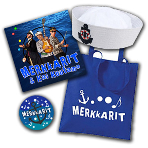 Mukana siis Merkkarit & Kai Kuutamo -levy, kansimieshattu, kangaskassi ja pinssi.