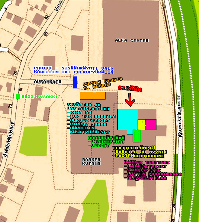 kutomorakennuksen sisäpiha Alfa Centerin vieressä (Katso karttakuva). Esityksiä on sekä sisällä, että sään